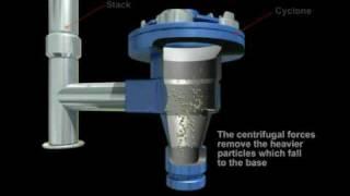 After entering the cyclone it begins to spiral where centrifugal forces remove the heavy particles